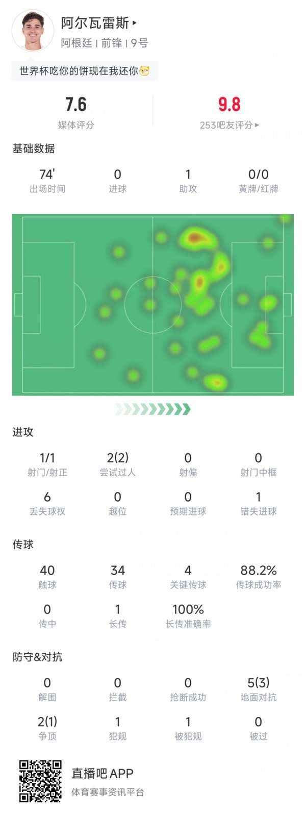 阿尔瓦雷斯在进攻端展现出全面的技术能力,他完成了一次射门并命中目标,同时成功完成了两次过人突破。尽管在比赛中错失了一次得分良机,但他的整体传球成功率高达88.2%,展现出极佳的控球和分配能力。