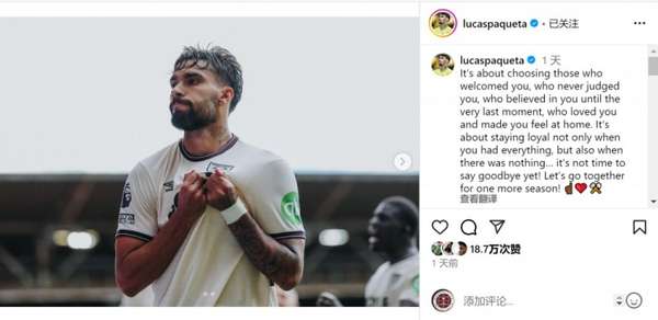 来源:360直播2025-09-13 08:06:50西汉姆联中场核心卢卡斯·帕奎塔今日通过个人社交媒体正式确认新赛季将继续为“铁锤帮”效力。这位巴西国脚发布了一张手持球队队徽的照片,并配发长文深情表态,明确否认了此前盛传的离队传闻。