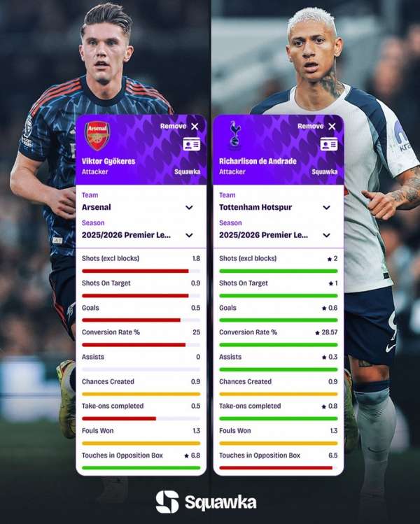 北伦敦德比锋线对决:里沙利松多项数据占优 约克雷斯仅禁区内触球略胜